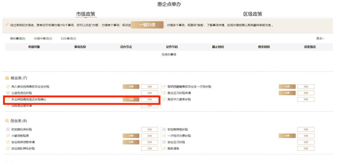 5、用人单位确认成功后,如需查询进度,可再次点击”惠企点单办”入口,选择“就业补贴:失业保险稳岗返还补贴确认”,查看“审核状态”(状态包括审核中,公示中,发放成功/发放不成功等)。