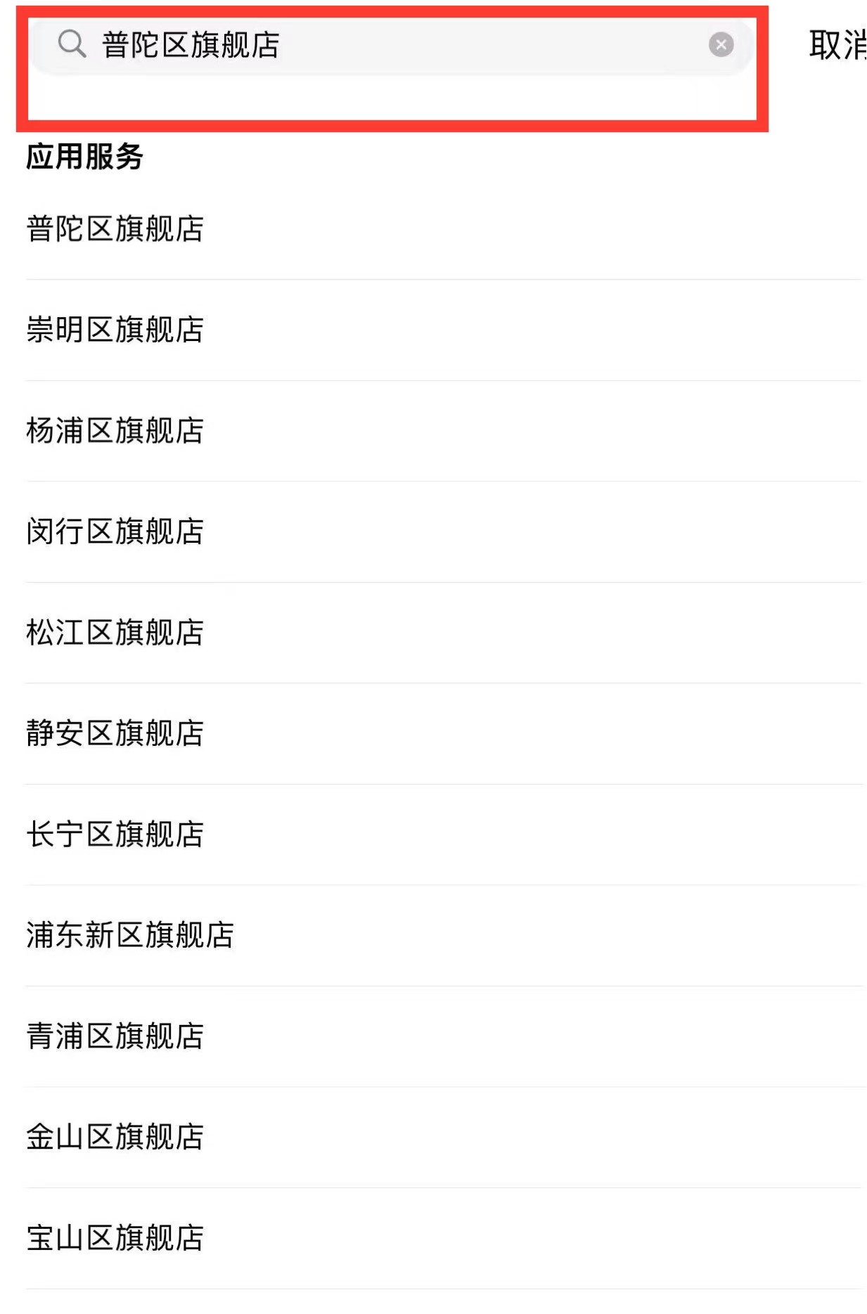 二、点击首页搜索框“上海”,找到“普陀区”,点击“普陀区旗舰店”进入主页。