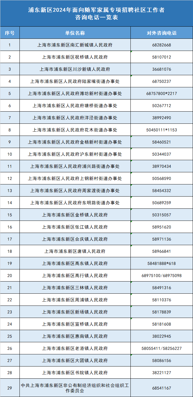 报考人员如需咨询岗位条件、资格审查、体检等相关内容,请联系招聘单位,咨询电话详见《浦东新区2024年面向随军家属专项招聘社区工作者咨询电话一览表》。