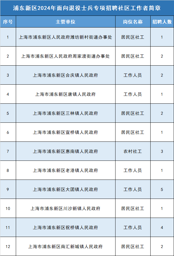 浦东新区2024年面向退役士兵专项招聘社区工作者公告