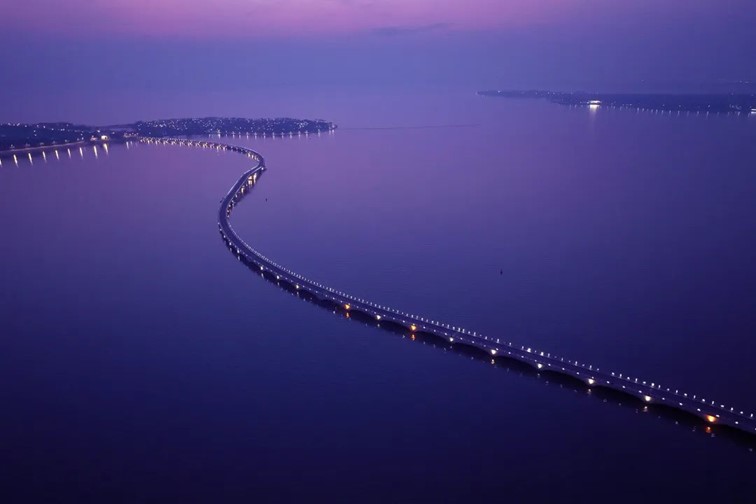 淀山湖上气势恢宏的彩虹桥,像一条明亮的长龙,掠过波浪起伏的湖面。桥体呈连环S形曲线,既像蜿蜒的游龙,又像飘逸的缎带,是淀山湖上一道亮丽的风景线。