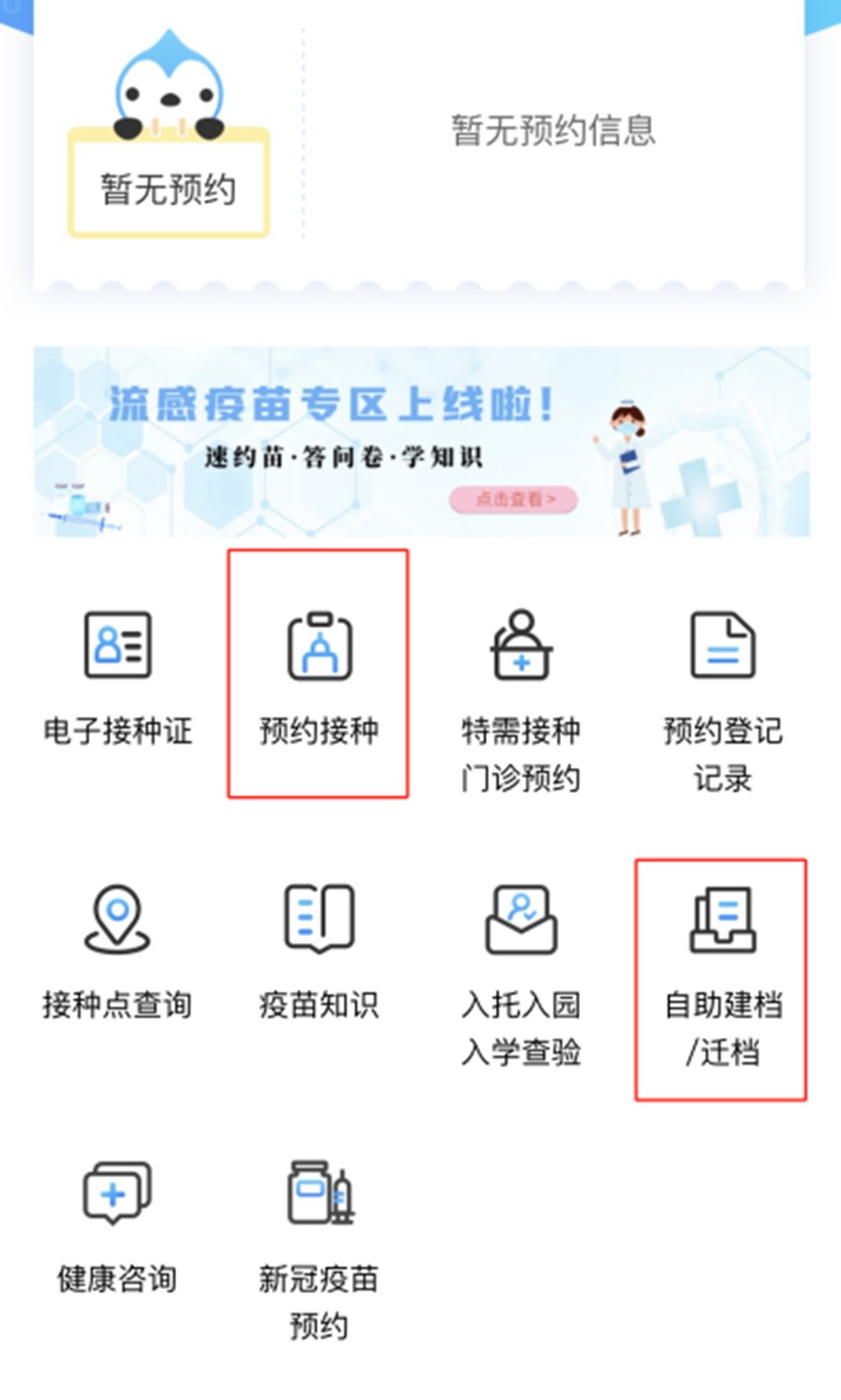 (2)首次预约先查询附近的接种点信息,点击“自助建档/迁档”。