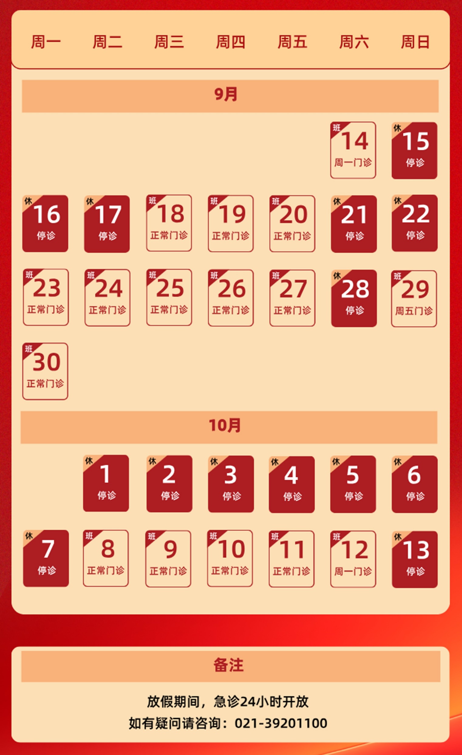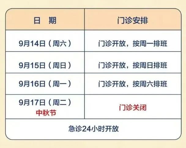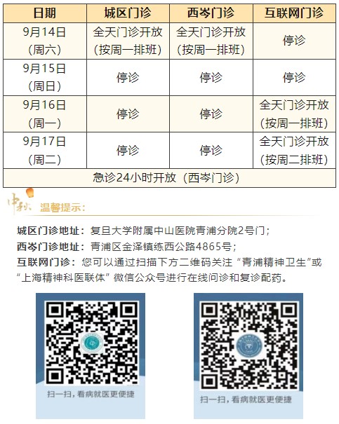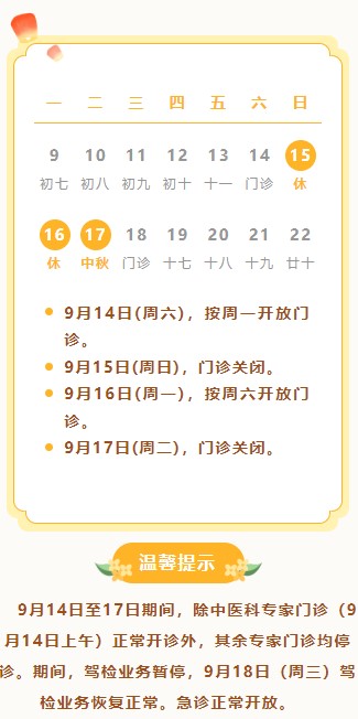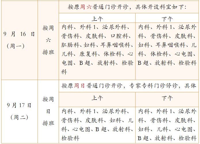 2、9月14日至9月17日所有专家、专科门诊停诊。