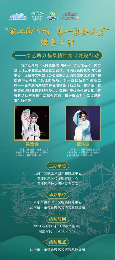 联合上海市文联艺术创作和促进中心开展“最江南听戏,第一茶楼品茗”强基工程——文艺助力基层精神文明建设行动活动。积极发挥江南第一茶楼作为新时代文明实践特色站在凝聚群众、引导群众的重要作用,在重点节日推出优质文明实践活动,将昆曲、越剧、黄梅戏等传统戏曲送到群众身边,弘扬中华优秀传统文化,将节日活动与市民生活结合起来,增进群众对“幸福温暖家”的热爱。