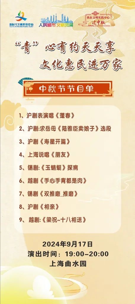发挥曲水园作为新时代文明实践公园在凝聚群众、引导群众的重要阵地作用,在中秋节推出优质文明实践活动,将沪剧、越剧、黄梅戏、上海说唱等传统戏曲送到群众身边,弘扬优秀传统文化,树立文明新风,增进群众对“幸福温暖家”的热爱。