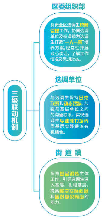 2、三级联动机制:区委组织部、选调单位、街道镇协同参与,多角度人才培育。