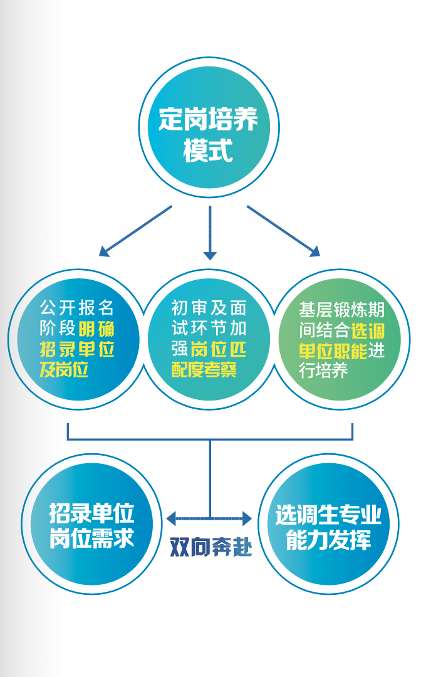 1、定岗培养模式:明确选调单位及科室岗位,针对性能力培养。