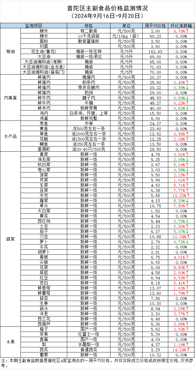 普陀区主副食品价格监测情况 (2024年9月20日)