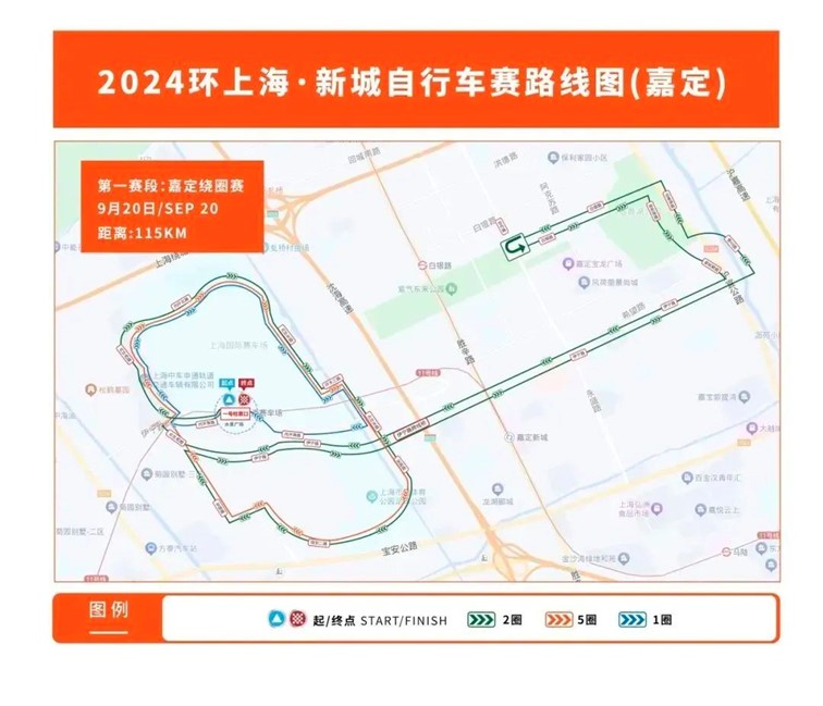9月20日第一赛段将在嘉定新城举行,全程约115公里,将从上海国际赛车场出发,7时30分至13时,自行车赛途径的内环西路—内环北路—内环东路—环东三路—外环东路—安辰路—规划二路—规划三路—安晓路—伊宁路—德立路—远香湖路—白银路(合作路折返)—白银路—裕民南路—伊宁路—外环西路—环西五路—内环西路—一号检票口(终点),在运动员临近时实施交通管控措施。