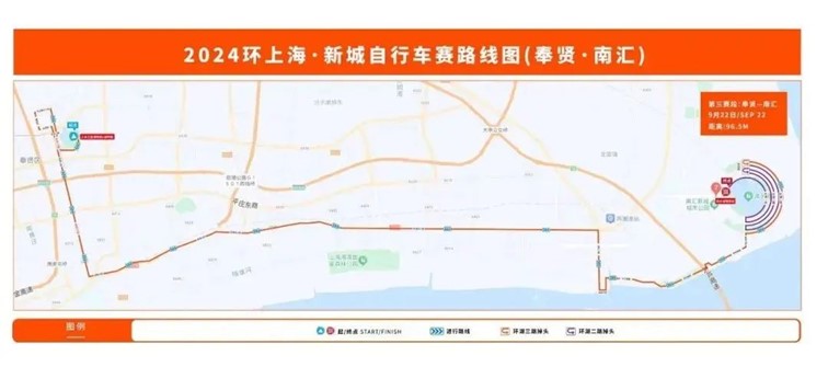 9月22日第三赛段将从奉贤新城至南汇新城,全程约96.5公里,0时至12时,自行车赛途径的上海之渔湖畔路—秀竹路—金海公路—东方美谷大道—望园路—树贤路—金海公路—港漕公路—两港大道—南芦公路—海塘大堤—杭湾路—世纪塘路—南港大道—环湖南三路—环湖东三路—环湖北三路(乔柏路折返)—环湖北三路—环湖东三路—环湖南三路右转—南港大道右转—环湖南二路—环湖东二路—环湖北二路(乔柏路折返)—环湖北二路—环湖东二路—环湖南二路右转—南港大道右转—环湖南一路—环湖东一路—环湖北一路—滴水湖地铁站(终点),在运动员临近时实施交通管控措施。