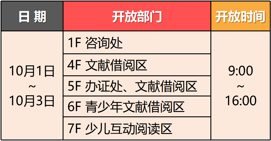 友情提醒:10月4日起恢复正常开放时间。入馆无需预约,馆内停车位有限,建议读者选择绿色出行。