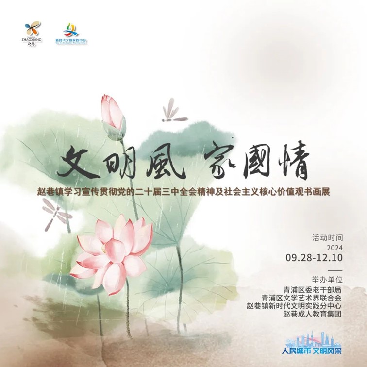 为共同庆祝国庆这充满喜悦与自豪的伟大时刻,赵巷镇新时代文明实践分中心、赵巷镇创建全国文明城区工作指挥部办公室依托青浦区文联“文联小课堂”活动开展“文明风·家国情”——赵巷镇学习宣传贯彻党的二十届三中全会精神及社会主义核心价值观书画展,于2024年9月28日—12月5日在“in赵巷”公众号线上展出书画作品,既有雄浑大气的墨宝,也有气韵生动的画作,一笔一划饱含着对党的赞美,一墨一色传递着文化自信,是青浦书画名流共同奉献的一场艺术盛宴,更是对党的二十届三中全会精神的崇高献礼。
