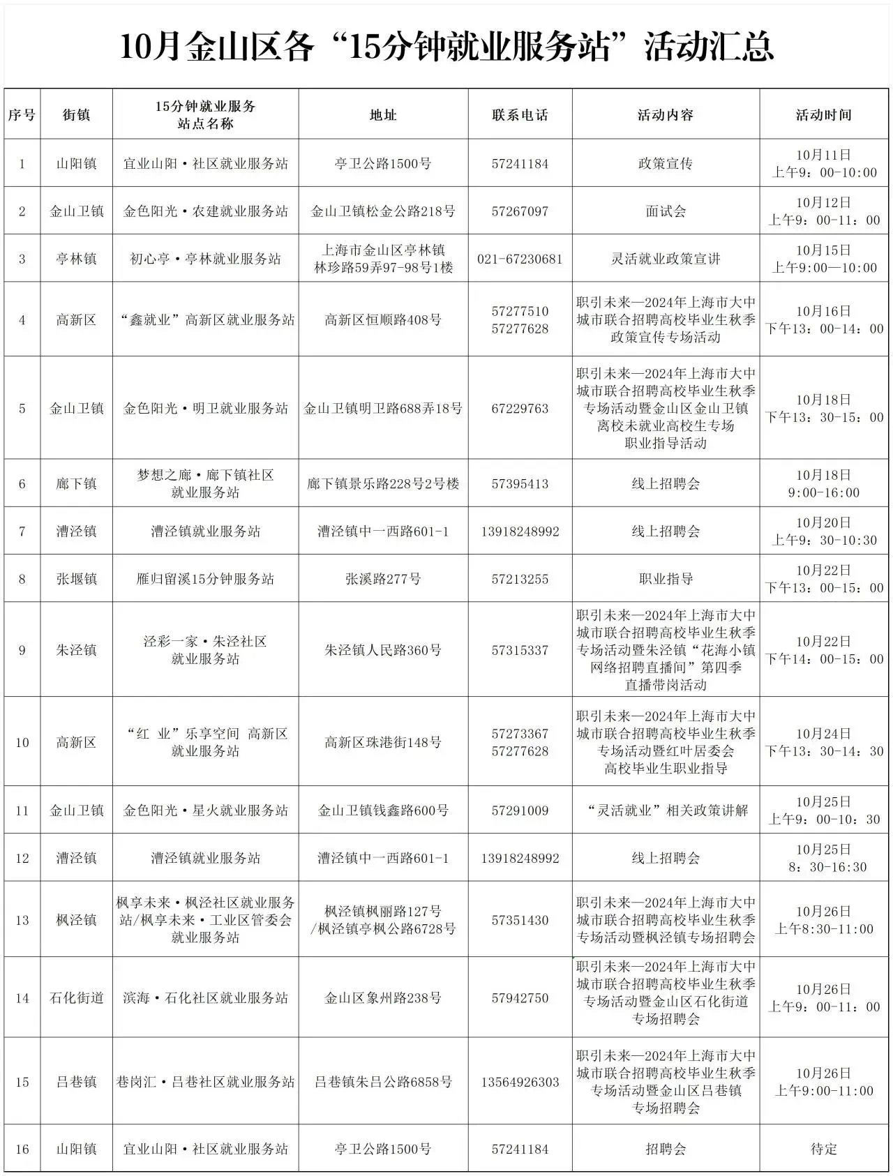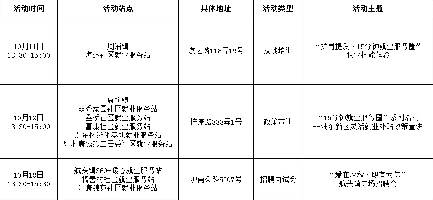 “15分钟就业服务圈”社区就业服务站点建设市政府实事项目作为人社部门常态化政府开放活动之一,我们将持续发布精彩服务内容,今天为大家带来徐汇、嘉定、浦东新区、崇明区、宝山区、金山区5区近期就业活动安排!