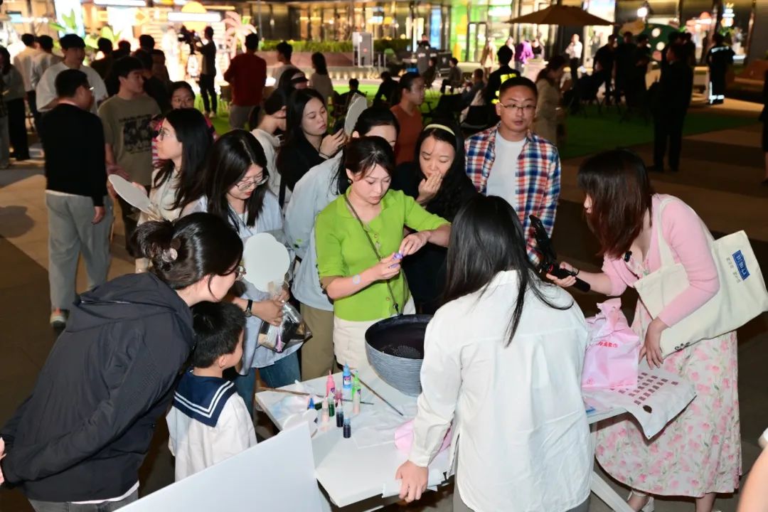 坐在露营椅上享受一场露天电影或乐队现场演出,挑选自己喜爱的颜色染制一把漆扇,还有充满童年趣味的丢沙包、夹弹珠、跳格子等互动小游戏,轻松愉快的氛围让身心舒畅。