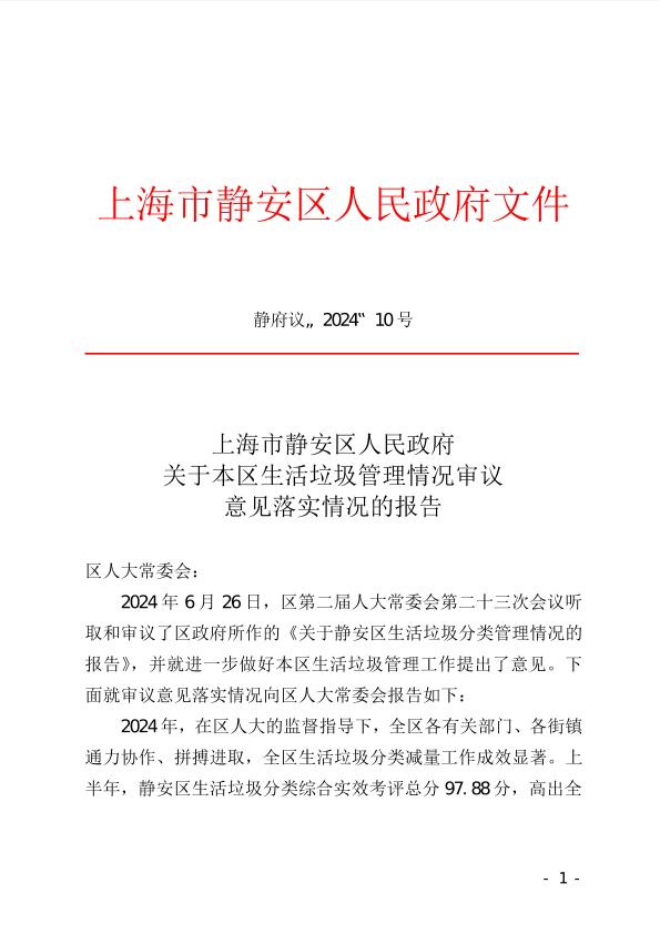 2024年6月26日,区第二届人大常委会第二十三次会议听取和审议了区政府所作的《关于静安区生活垃圾分类管理情况的报告》,并就进一步做好本区生活垃圾管理工作提出了意见。下面就审议意见落实情况向区人大常委会报告如下: