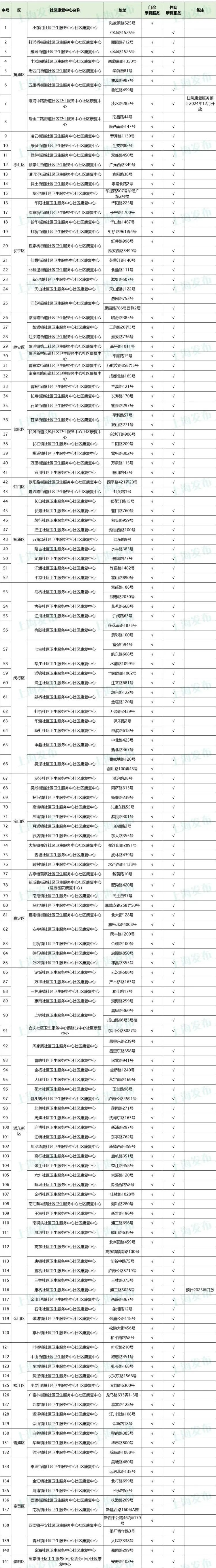 2024年,本市依托“为民办实事”项目,继续推进社区康复中心建设。截至目前,已顺利完成第四批22家社区康复中心建设,年度为民办实事项目超额完成,全市社区康复中心总数达到141家。社区康复覆盖面进一步扩大,“家门口”的康复服务能级再上新台阶。全市141家社区康复中心名单详见。