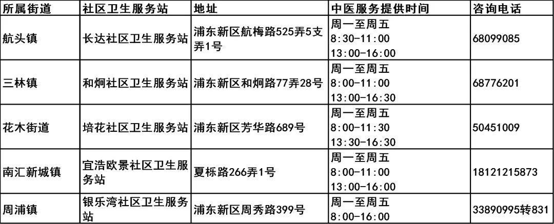 浦东新区中医药特色巡诊社区卫生服务站开放服务时间表