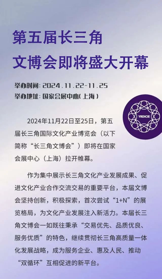 普陀等你来!第五届长三角文博会将于11月22日至25日举办,快来预约观展! 2024-11-07 来源:普陀区人民政府