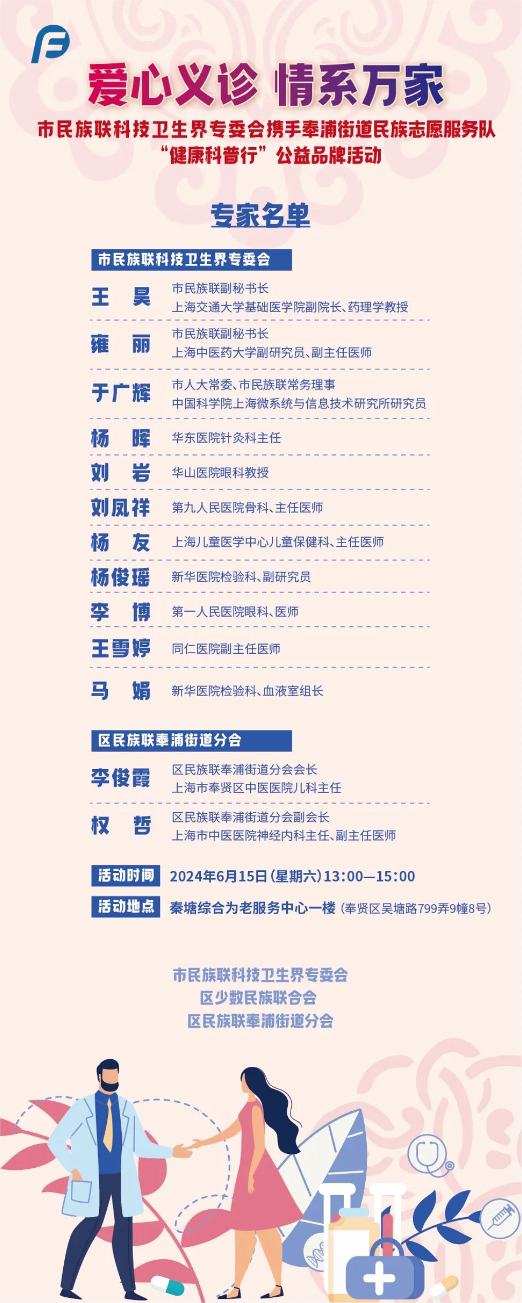 为了让广大市民能够在家门口就便捷享受优质医疗服务,并促进各族同胞间的深入交流与融合,市民族联科技卫生界专委会携手奉贤区奉浦街道民族志愿服务队于本周六开展大型健康科普义诊活动。