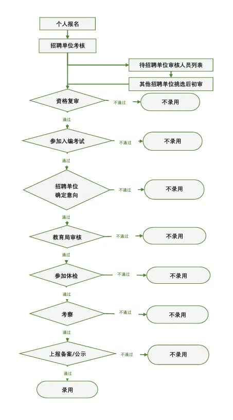 招聘单位对应聘人员进行资格初审。对资格初审通过的人员,招聘单位安排面试、试讲、笔试等考核。招聘单位的考核方案须交主管部门核准备案。考核通过的应聘人员一般按岗位需求数1:3的比例择优推荐参加统一的进编考试。具有高级教师职称的应聘人员经招聘单位考核后报区教育局审核备案。