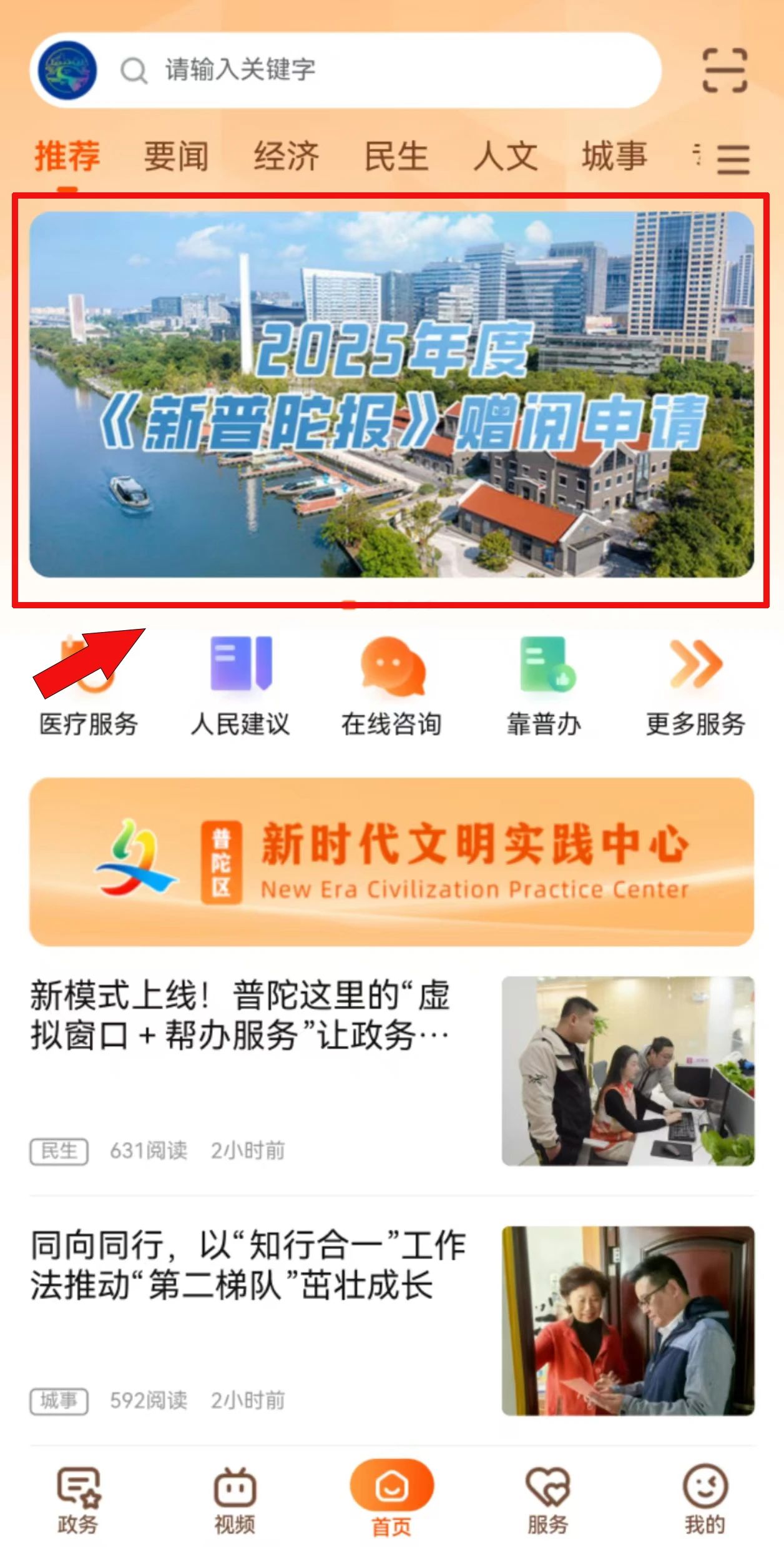 第一步:每位用户可登录上海普陀APP,点击首页2025年度《新普陀报》赠阅申请。