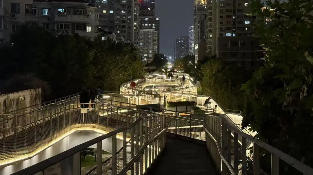 当夜幕缓缓降临,百禧公园中的线型钢铁廊桥在暖黄色灯光的照耀下,宛如一条金色绸带镶嵌于两侧楼宇间。