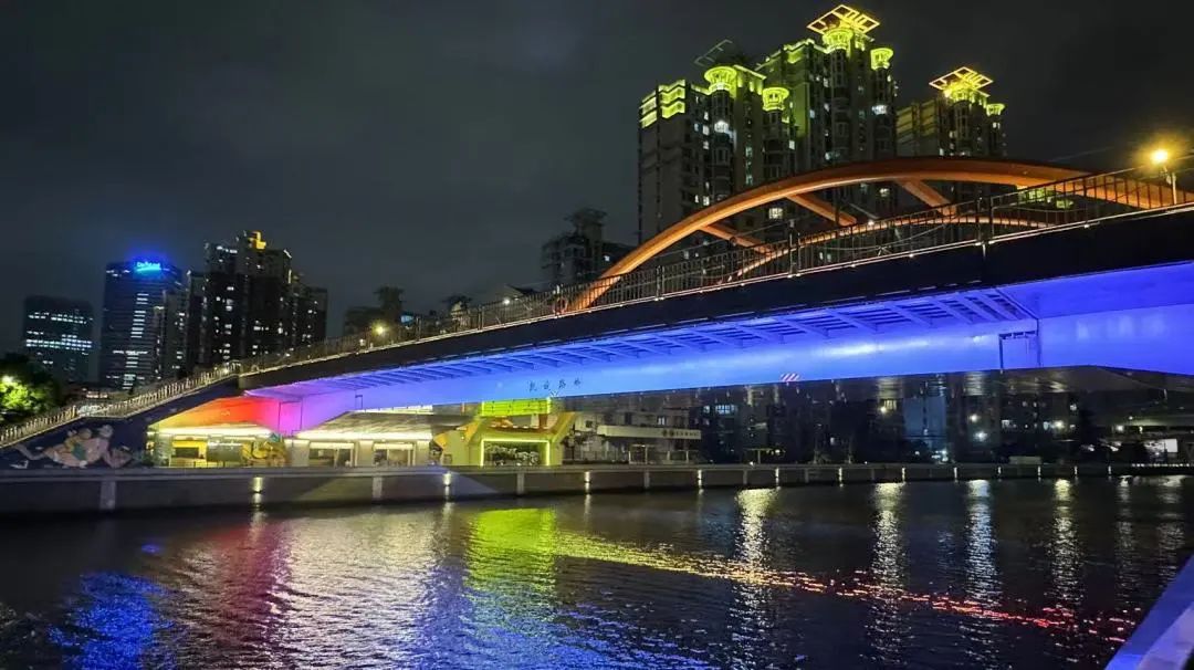 一路步行至苏州河岸边,凯旋路桥在夜色中更显壮观。赤橙黄绿青蓝紫,七彩灯光交相辉映,宛如一座横跨苏州河的彩虹桥。