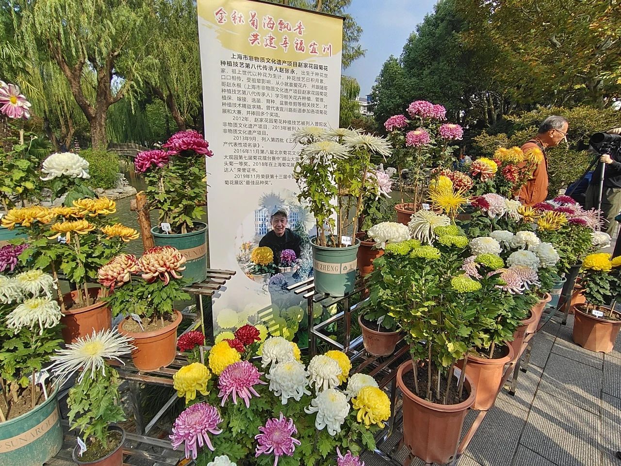 采菊东篱下,悠然见南山。今年,位于普陀区的宜川公园菊花展迎来了一波又一波前来欣赏的市民游客。1600平方米布展面积,23000余盆菊花,60多个珍贵品种,让人目不暇接。其中,上海市级非遗项目——赵家花园菊花种植技艺第八代传承人赵张永培育的各色菊花尽数开放,为展览添上一抹非遗色彩。