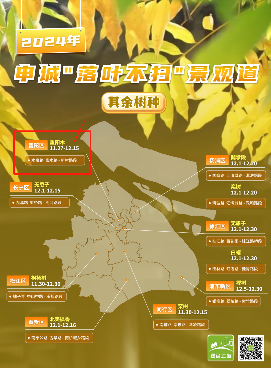 落叶不扫,并非真的对落叶置之不理,而是有选择性地进行精细化养护清扫。实行落叶景观路段的自然落叶不予清扫,自然保留,环卫作业人员仅对保留区域内落叶中的垃圾进行捡拾保洁,留住这份纯粹宁静的美感。让我们一起来看看2024普陀区“落叶不扫”景观道地图吧!