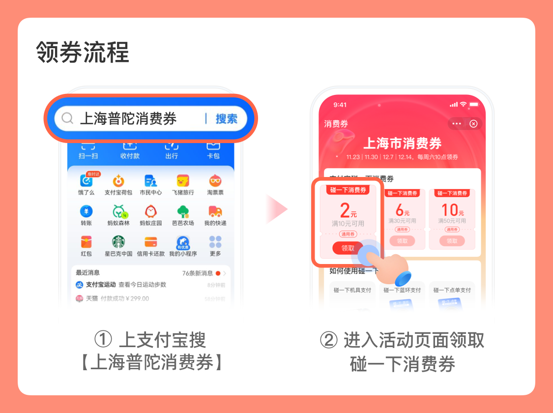 所有定位在上海的人员(包括外地来沪人员),均可上支付宝APP搜索【上海普陀消费券】,进入活动页面领取。