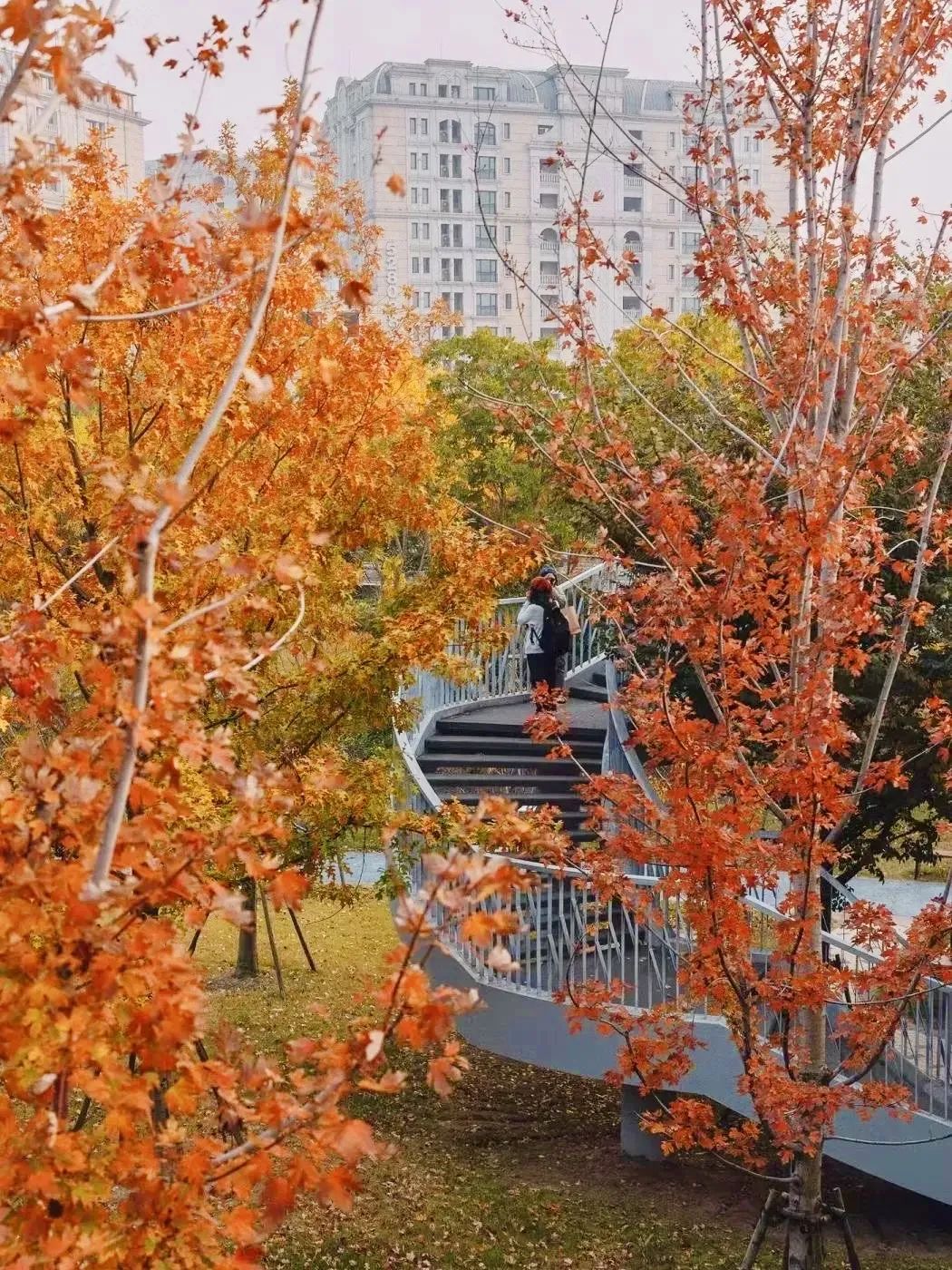 公园有座旋转楼梯,细碎的阳光,从楼梯旁边层层叠叠的叶片缝隙中洒下。拾阶而上,一步一景,入眼皆是颜色热烈的风景画。