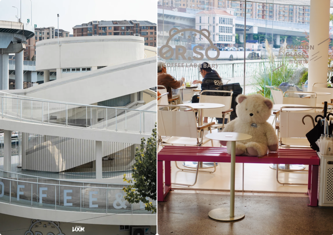 OR.SOCoffeeLab&bar的白色旋转楼梯很出片,沿着环绕式步道还可以观赏苏州河畔风景。走入店内,点一杯咖啡,透过明净的玻璃窗,静赏苏州河。