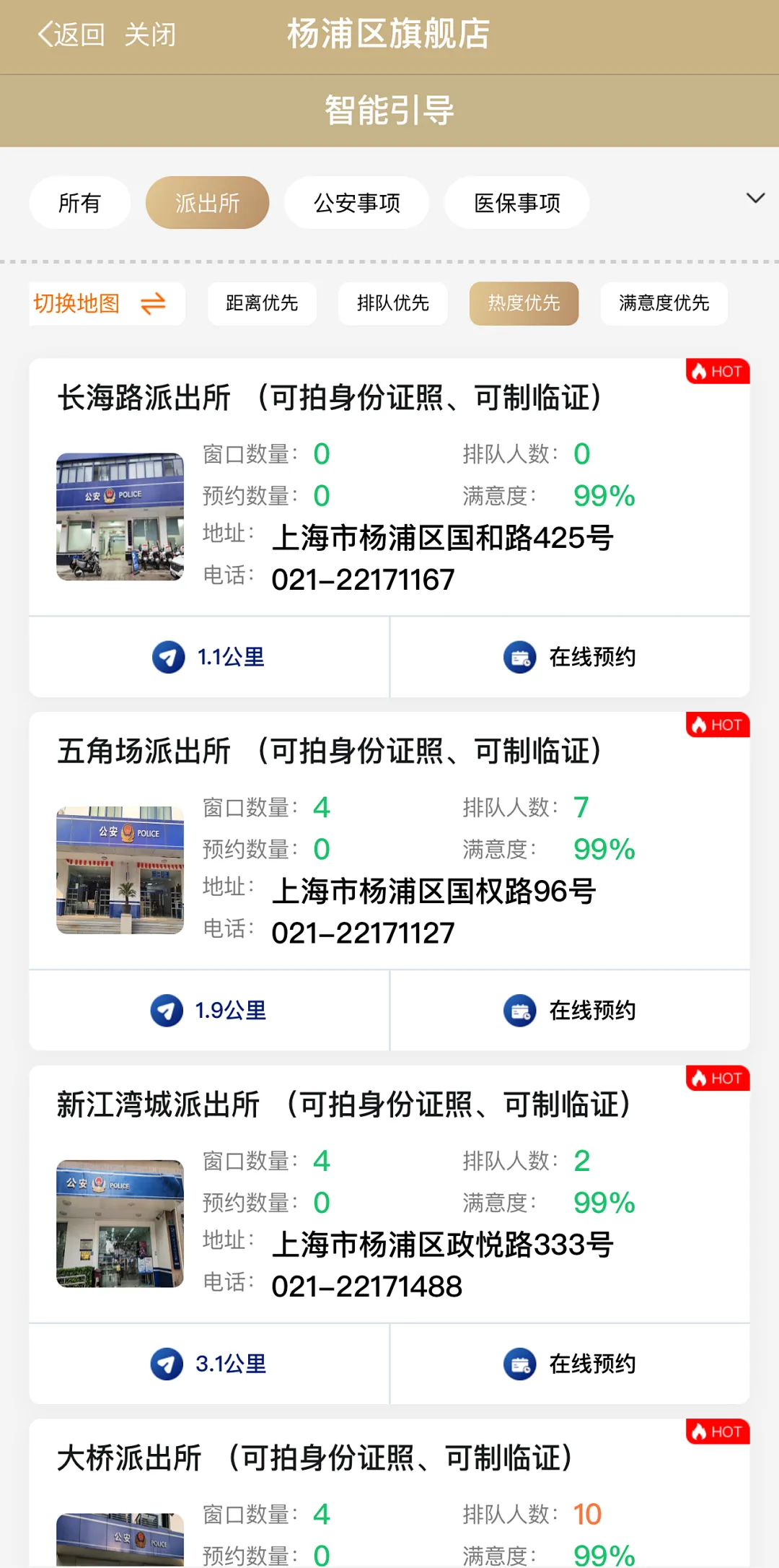 从杨浦公安分局人口办了解到,市民在换证前可先通过派出所综合大厅业务办理“热力图”来判断去哪家派出所最便捷、最省时。市民只需打开“随申办”APP内的“杨浦旗舰店”,就能分级分色实时掌握杨浦13家户籍派出所窗口排队人数、窗口地址、联系电话、距离远近等信息。