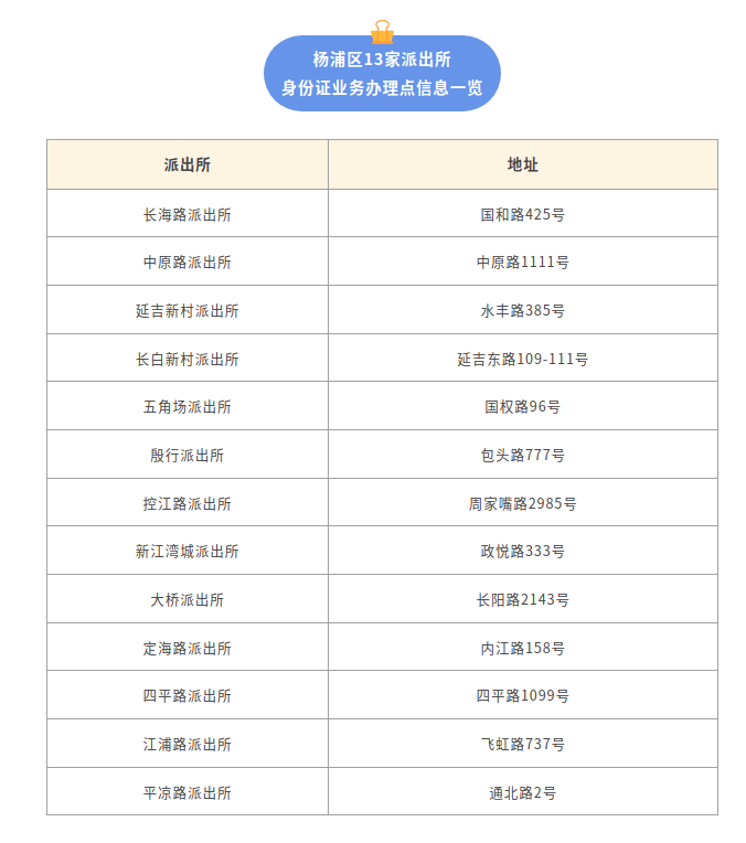 据悉,居民身份证业务已实现“全国通办”,您可选择就近的公安派出所户籍窗口申请换领居民身份证。在杨浦辖区内,可办理身份证换证业务的公安派出所共有13家。其中,殷行街道范围内有2家派出所,其他11个街道各有1家派出所。