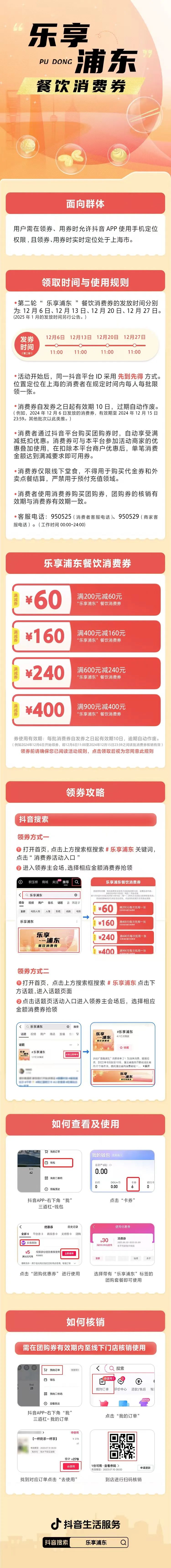 抖音APP:可在“我的订单-卡券红包”点击消费券查看,也可在搜索框搜索意向商户,如果商户团购券带有“乐享浦东”或“浦东专用餐饮券”标签,即可下单抵扣。