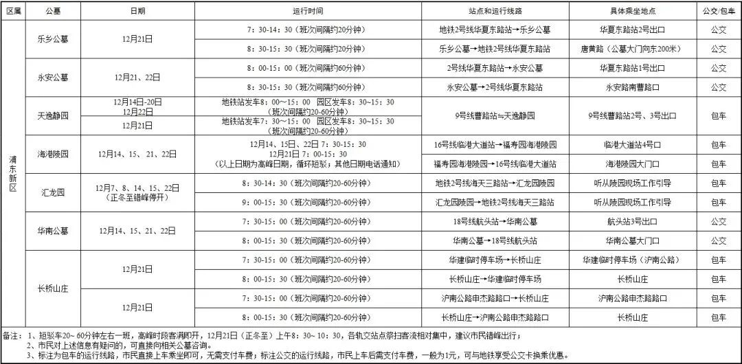 1.短驳车20~60分钟左右一班,高峰时段客满即开,12月21日(正冬至)上午8:30~10:30,各轨交站点祭扫客流相对集中,建议市民错峰出行;
