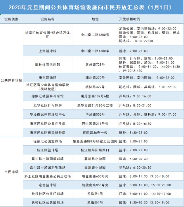 2025年元旦节不调休周中休息,想要锻炼去哪里呢?小编给大家整理了2025年元旦期间公共体育场馆设施汇总表,需要的赶紧Mark一下!