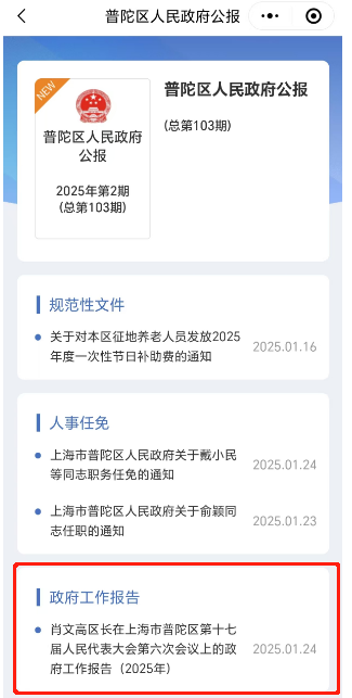 《普陀区人民政府公报》是区政府及各部门、各街镇全量政策文件集中、统一、动态发布的首发首端和官方渠道,是刊登文件标准文本的法定载体。普陀区作为本市政府公报数字化转型试点区,自去年上线“普陀区人民政府公报”微信小程序后持续优化升级,今年和“上海普陀”门户网站同源发布2025年政府工作报告全文版。