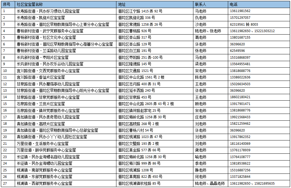 2024年,普陀区依据10个街镇居民“15分钟社区生活圈”的行动蓝图,将立体化的独立宝宝屋嵌入普陀全域平面图中,完成每个街镇2-3个“宝宝屋”的建设要求,已逐步推出27个社区“宝宝屋”,为有需求的1-3岁婴幼儿家庭提供社区“临时托”服务。以下为普陀区27个社区“宝宝屋”的相关信息~
