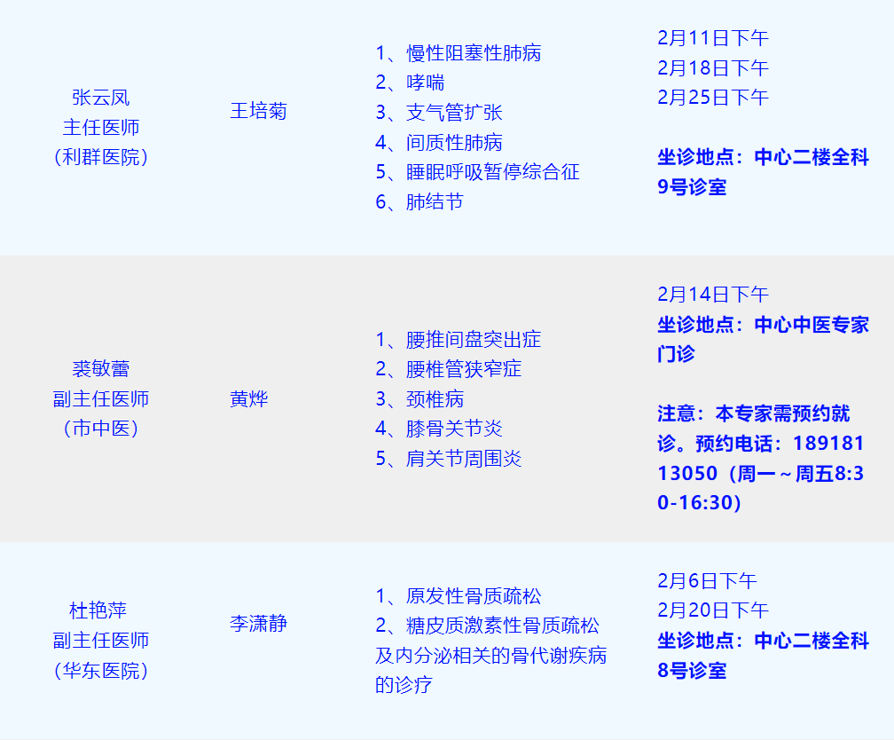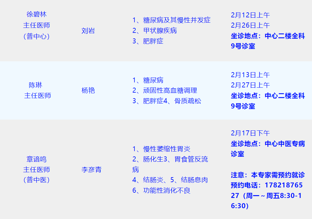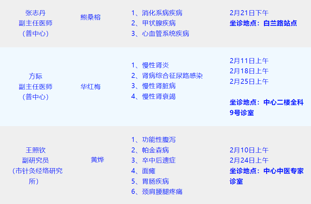 为了让桃浦地区居民享受优质的中医及康复医疗资源,桃浦镇社区卫生服务中心特邀请龙华医院、普陀区中医医院等知名中医及康复专家来我中心开设中医及康复专家门诊。现将12月份的中医及康复专家门诊向各位患者公示,如有就诊需求可通过电话进行咨询和预约(66260808*8568)。