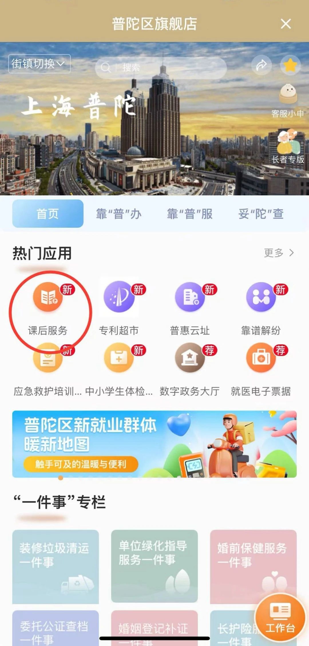 在普陀旗舰店首页点击进入“普陀区课后服务”。