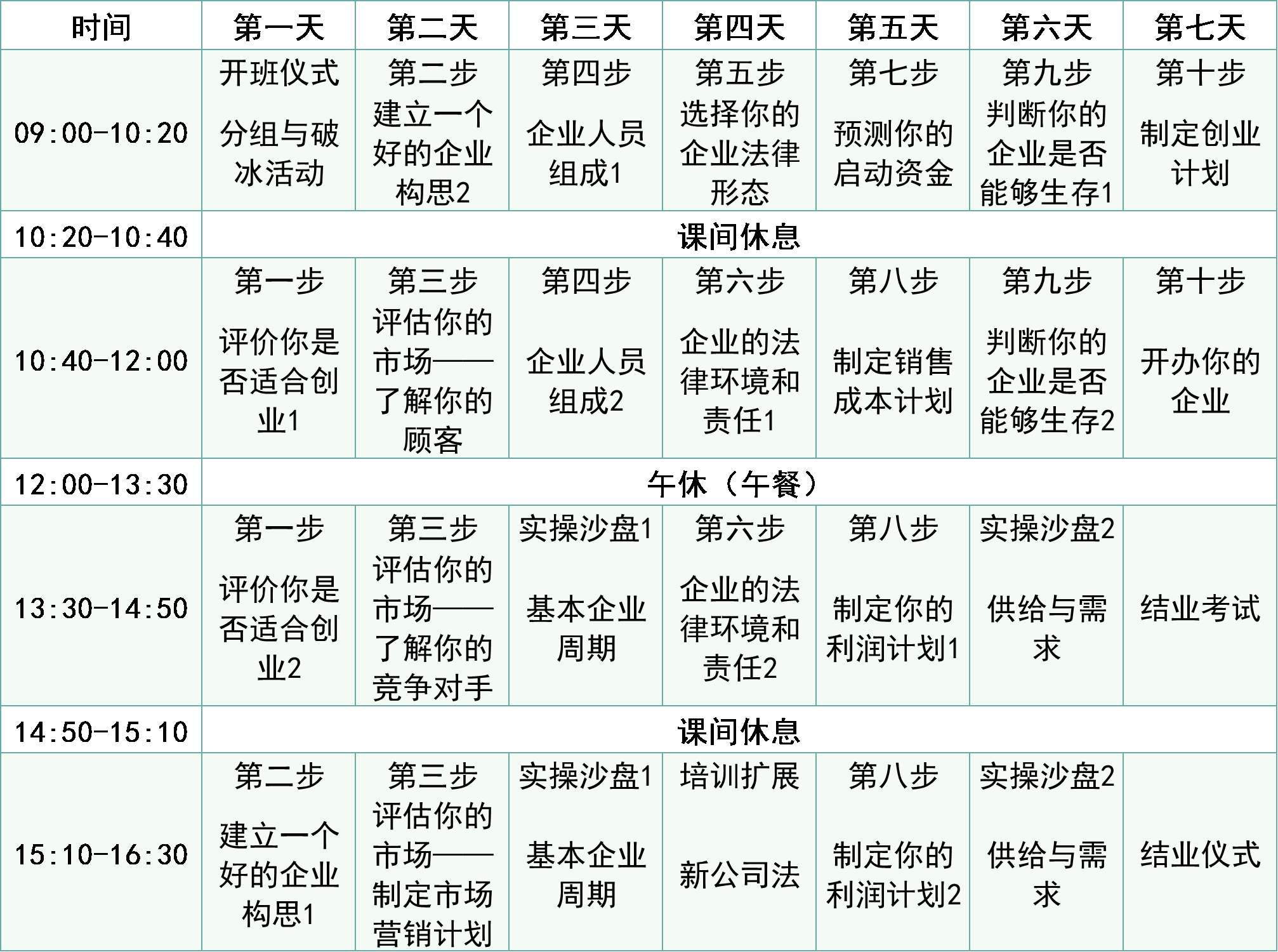 培训为期7天,以SIYB(创办和改善你的企业)课程为基础,针对有意愿开办自己中小企业的学员开展课程,为学员提供与时俱进的创新创业知识,帮助学员培养创业意识,掌握创业技能,增强小微企业抗风险能力。