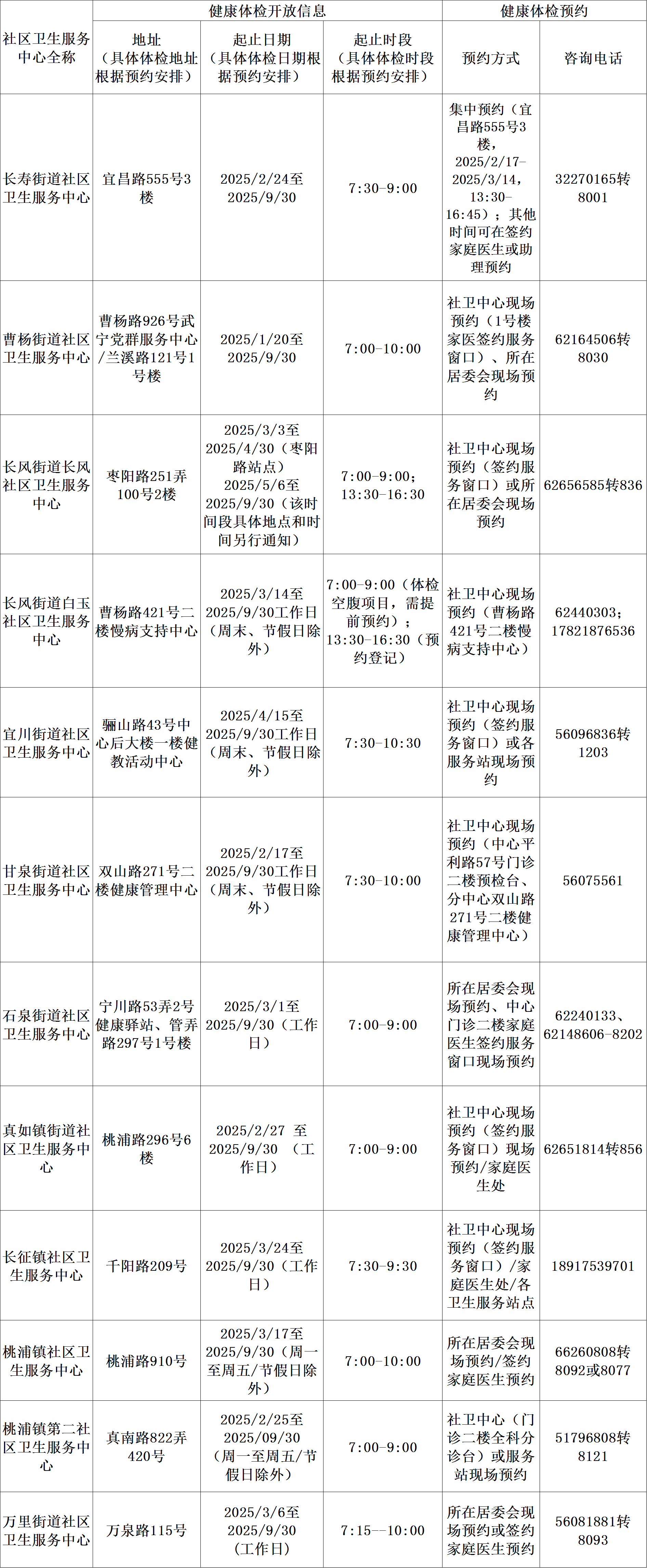 上海65岁及以上老年人免费健康体检信息一览表(2025年)
