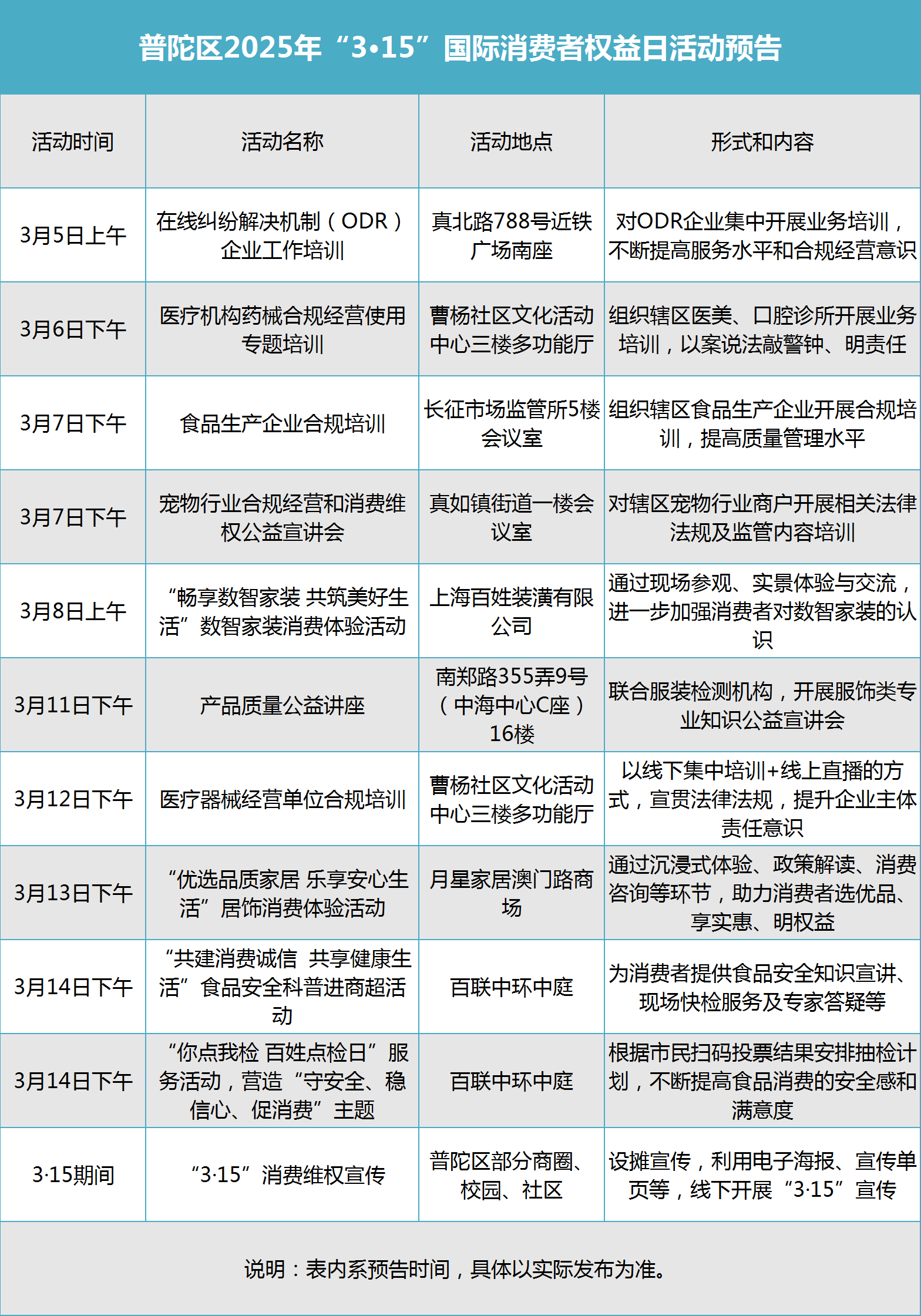 2025年“3·15”国际消费者权益日即将到来,围绕“共筑满意消费”年主题,普陀区市场监督管理局、普陀区消费者权益保护委员会共同制定了“3·15”活动方案,通过开展典型案例公示、消费现场体验、设摊宣传、专项活动等,全力营造诚信、公平、便捷、安全的消费环境,进一步提振消费信心,激发市场主体活力。