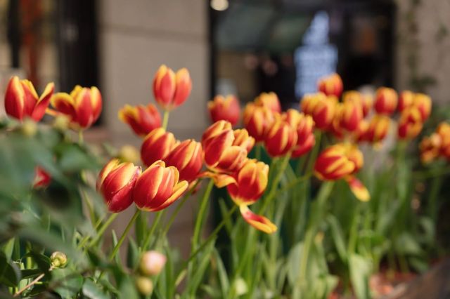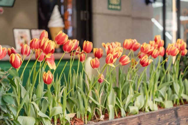 新乐路82号本土服饰品牌BASEMENTFG的铸铁门廊下,忽然游来一尾尾玻璃质地的火焰,那些被修剪整齐的郁金香“军团”以鳞茎中贮藏的整季月光为盾,正抵御着梧桐絮与汽车尾气的侵扰。霓虹在杯状花盏里酿出鸡尾酒色,六枚花瓣随着自动门的开合轻颤,像未读的短信悬浮在春夜的缓存区。
