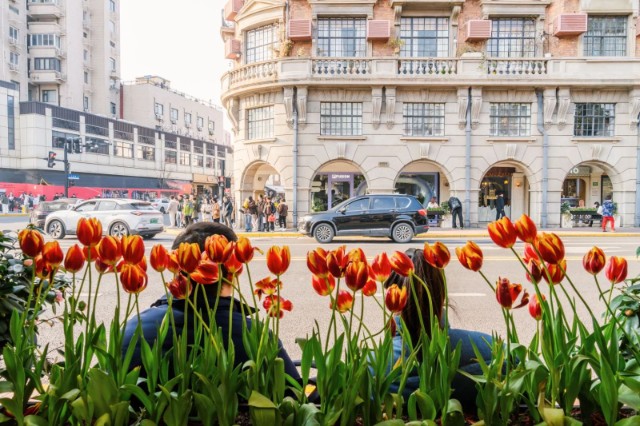 在武康大楼的脚下,一片郁金香花带悄然绽放宛如一幅绚丽的画卷铺陈于春日的怀抱之中,那一朵朵郁金香或娇羞地低垂着头似少女怀春的羞涩,或昂然挺立如勇士般骄傲地展示着自己的风姿。
