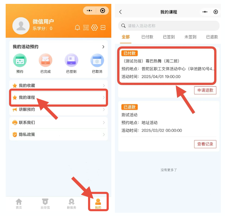 第六步:报名成功的学员可在“我的”-“我的课程”中,查看已报名课程及签到二维码,如遇特殊情况有退费需求,可在规定时间内在“我的课程”内申请退款,退款流程详情请见下文。