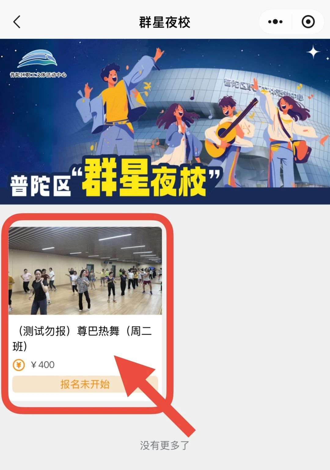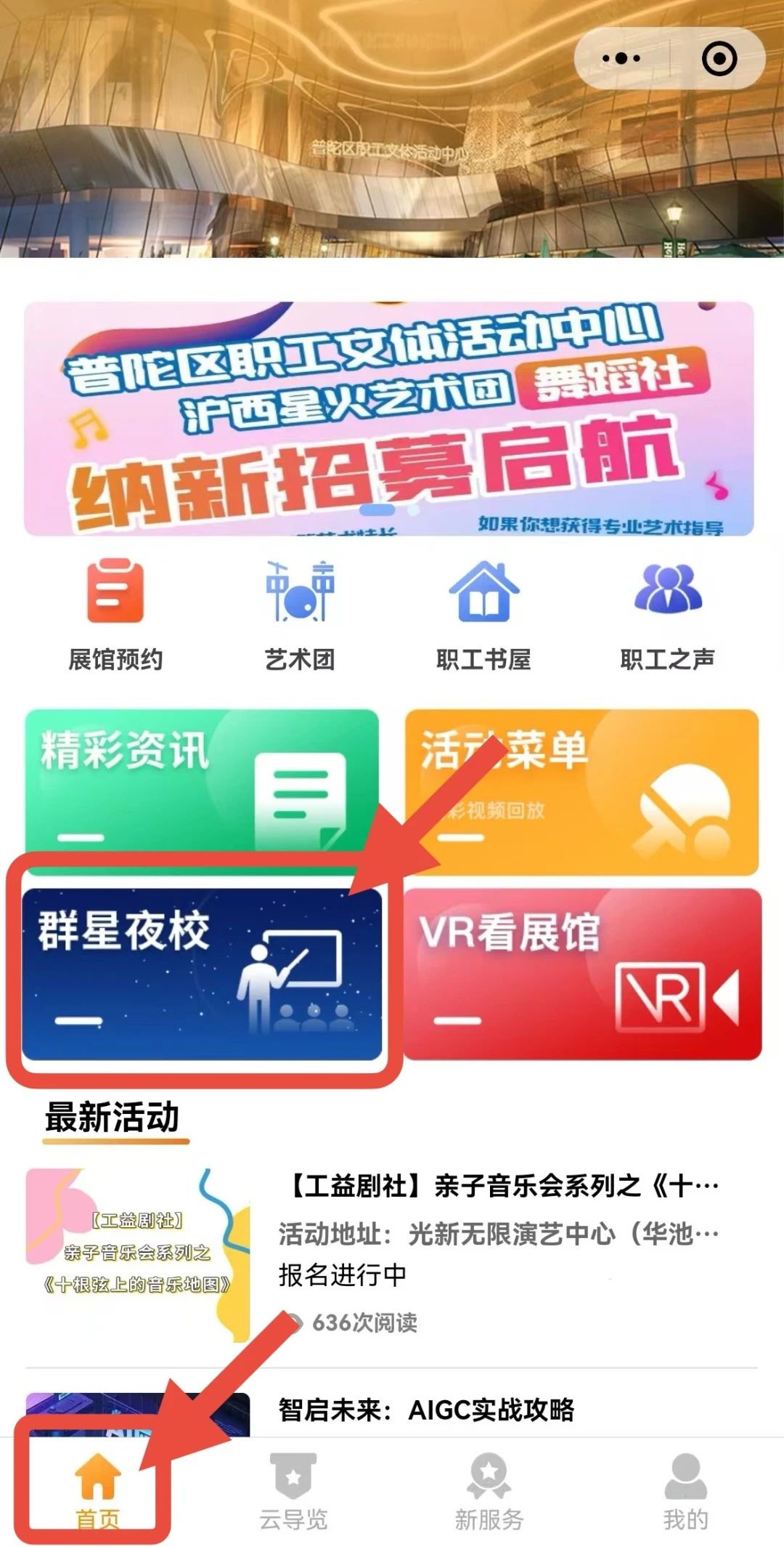 第一步:打开“普陀区职工文体活动中心”小程序进入“首页”,点击“群星夜校”版块;