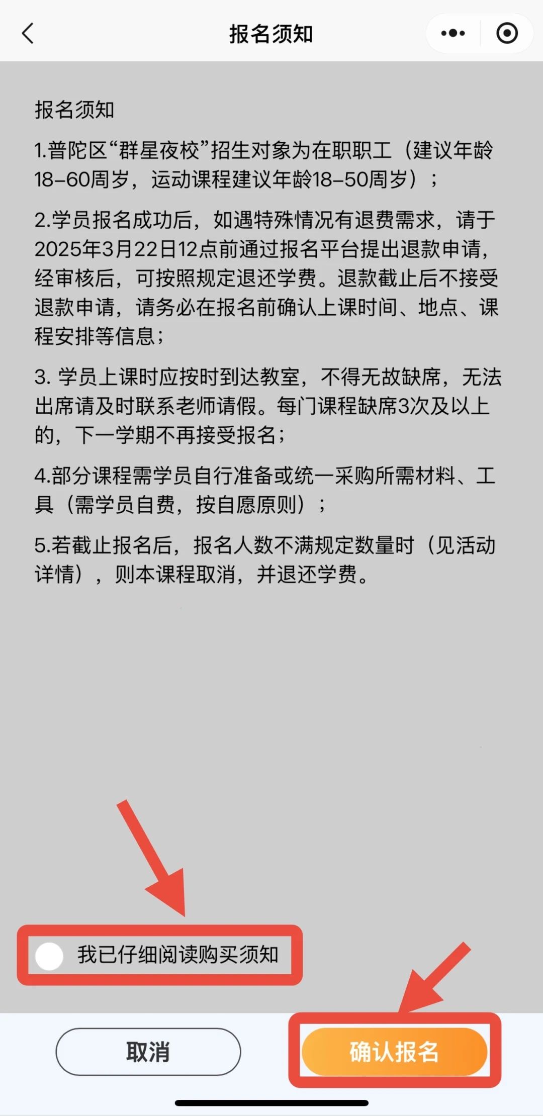 第四步:点击“确认报名”,仔细阅读“报名须知”内容,勾选“我已仔细阅读购买须知”,再次点击“确认报名”,并支付学费;