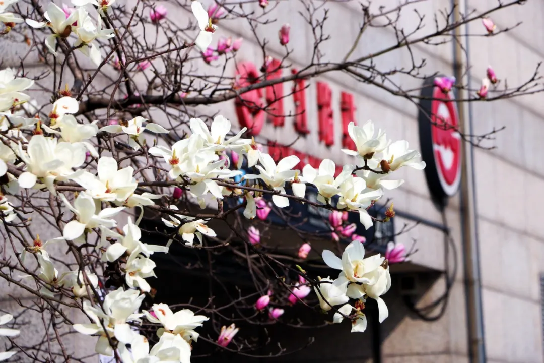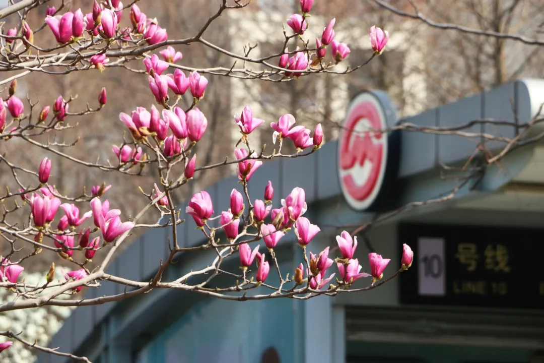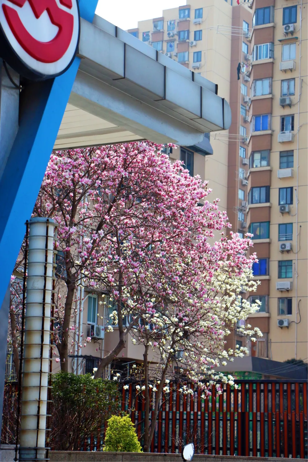 此外,在8号线黄兴路站3号口、嫩江路站4号口及10号线四平路站1号口、同济大学站5号口等地铁口,朵朵玉兰在空中“爆花”,与沿路的建筑、街景编织成一幅早春油画,吸引着不少市民驻足拍照。